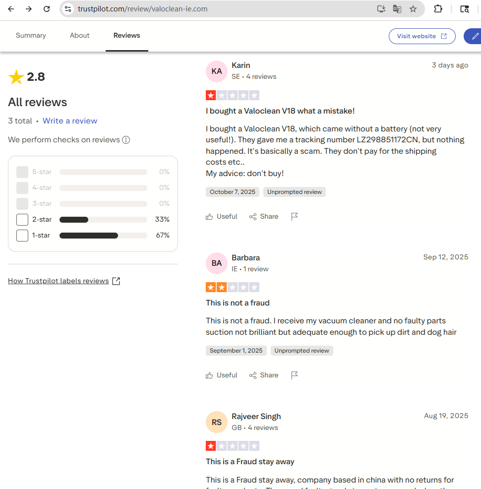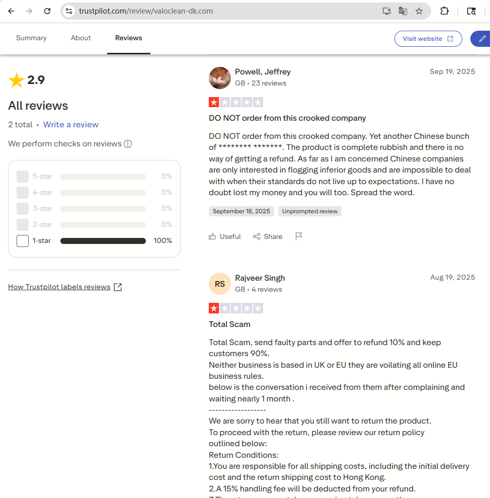 We have identified a network of fraudulent websites falsely trading under our name. The main site currently in operation is valocleans.co.uk (note the extra “s”). Their original domain, valoclean.co.uk (no “s”), was suspended by the service provider due to fraudulent activity. The same group has since created a series of copycat domains following the pattern valoclean-<countrycode>.com — for example valoclean-se.com, valoclean-de.com and valoclean-au.com — i.e. “valoclean” plus a hyphen and a country code.